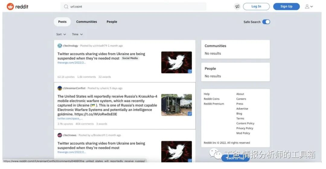 调查人员可以通过将“keyword”替换为上述URL中的相关URL或关键字(例如https://www.reddit.com/search?q=url:osint)来搜索包含URL或URL中的关键字的帖子。