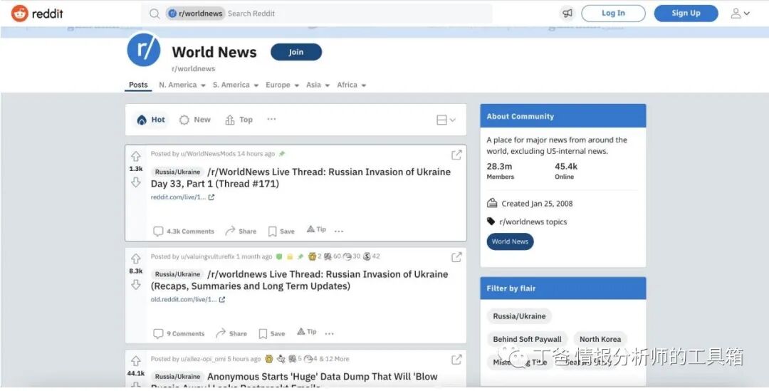 Reddit是一个社交新闻聚合、网络内容评级和讨论网站,成立于2005年。Reddit是美国第7大访问量最大的网站,也是世界第19大访问量的网站,每月活跃用户超过4.3亿。本指南将向您展示如何使用Reddit进行OSINT调查。我们将讨论定位配置文件,搜索和提取内容,向您展示如何从Reddit为您的OSINT调查获得最大价值。Subreddits是Reddit网站内专门讨论特定主题的论坛。Subreddits允许用户发布和评论一个特定的兴趣或主题相关的子reddit名称。每一个Subreddit有自己的规则、版主和投票规则。Subreddits包含在以下格式的url中,www.reddit.com/r/subredditname,比如https://www.reddit.com/r/worldnews/。![]()