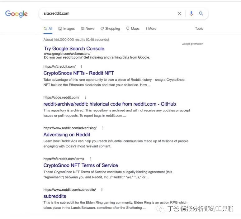 通过将/user/添加到我们的第一个查询的末尾,我们将搜索结果从166,000,000缩小到8,640,000,只显示Reddit个人资料页面。site:reddit.com/user/ “username”在site:reddit.com/user/查询后添加任何关键字将允许您搜索用户帐户在Reddit平台上。在进行此搜索时,您应该输入搜索字符串引号。例如,当搜索用户名“Gallowboob”时,我们可以使用查询网站:reddit.com/user/“Gallowboob”,将我们的结果从8,640,000减少到14,800。site:reddit.com/r/subredditname 通过将/r/subredditname附加到我们的原始站点:reddit.com查询的末尾,我们将搜索结果缩小到来自特定子reddit的搜索结果。例如,添加subreddit worldnews,我们可以使用查询站点:reddit.com/r/worldnews来指定我们只需要worldnews子reddit的结果,这将把我们的结果从166,000,000减少到163,000。site:reddit.com/r/subredditname “keyword/username”通过在引号中添加关键字或用户名的subreddit查询,我们将搜索结果缩小到包含特定关键字或由特定用户制作的特定subreddit内的搜索结果。例如,将“联合王国”附加到查询worldnews时,我们可以使用查询站点:reddit.com/r/worldnews“United Kingdom”来指定我们只需要来自worldnews子reddit的包含短语“United Kingdom”的结果,这将使我们的结果从163,000减少到3,340。重要的是要理解搜索引擎只能显示他们已经索引的页面,而不是任何存在的页面。因此,全新的用户帐户和帖子不太可能出现在搜索结果中。平台字段搜索url