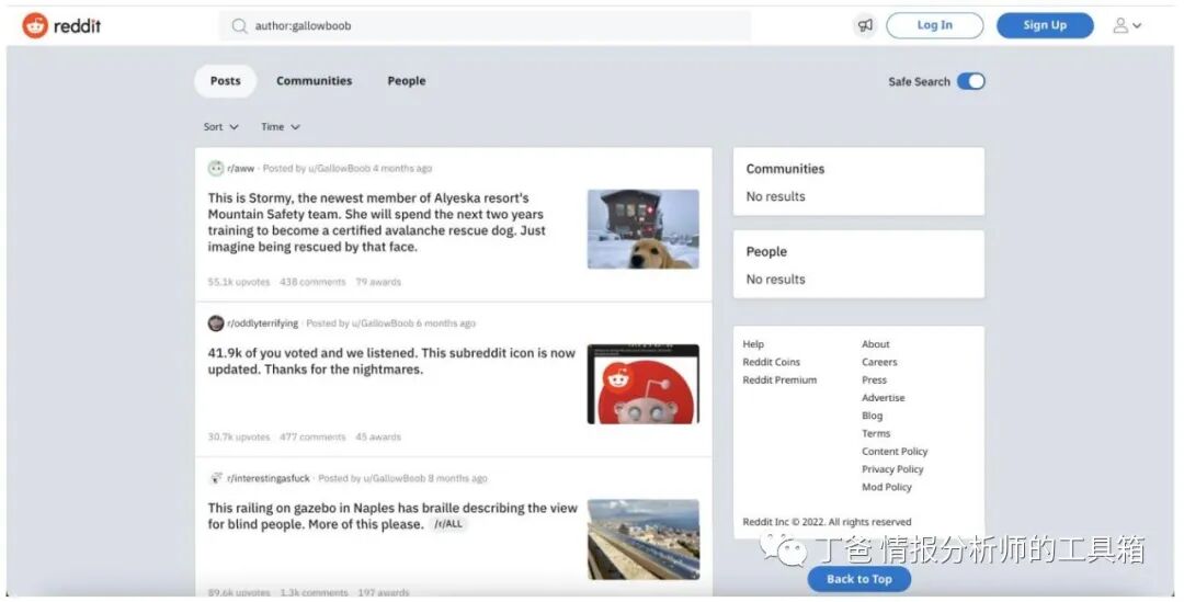 调查人员可以通过将上述URL中作者的用户名“username”替换为目标“用户名”来搜索特定Reddit用户发布的帖子。例如https://www.reddit.com/search/?q=author%3Agallowboob
