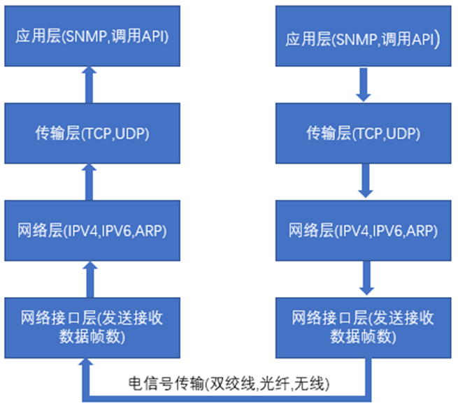 网络接口层主要通过双绞线,光纤,无线等方式进行网络上数据帧的发送和接收。网络接口层将网络层的数据组装成自己特定的帧进行发送,同时也会接收数据帧进行解析,并将解析过后的数据发送给网络层。