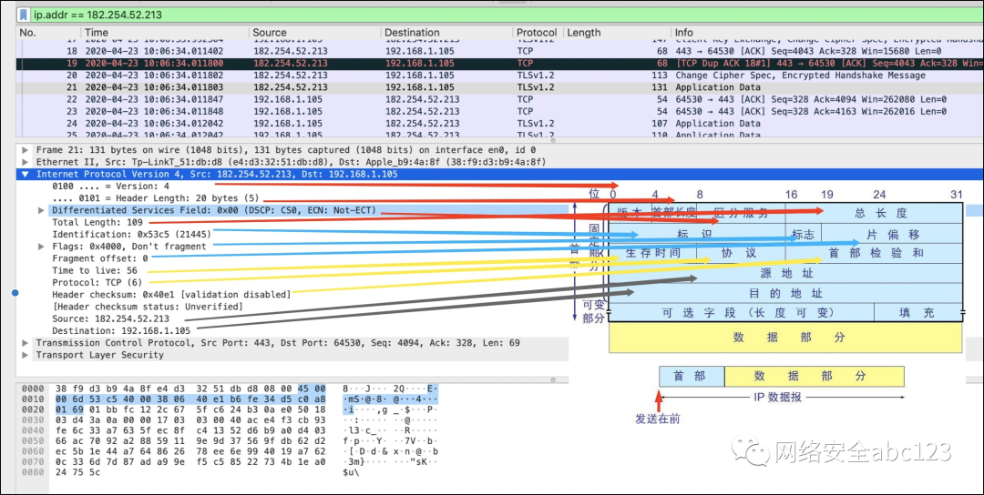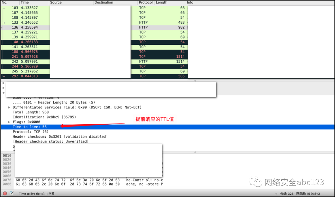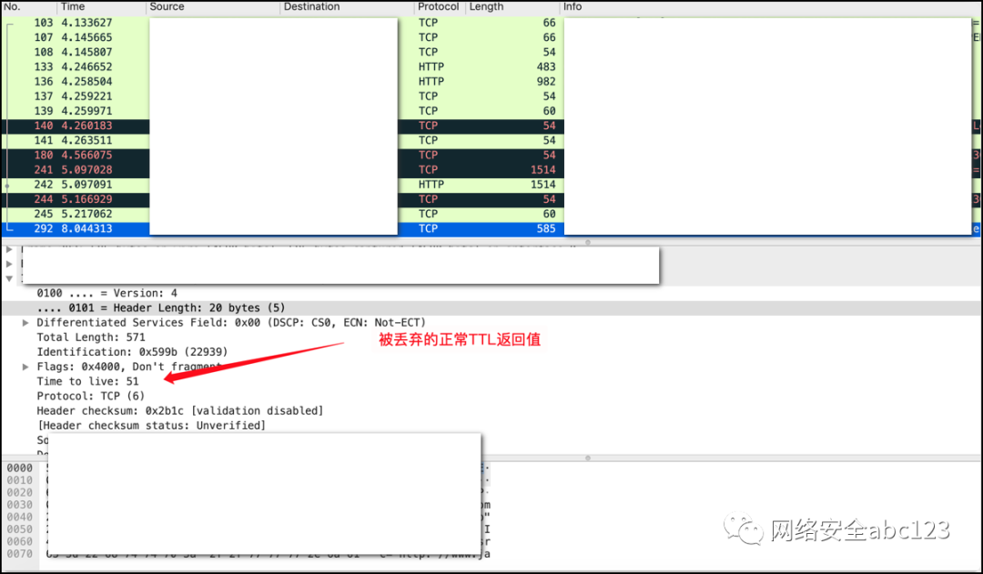进一步分析,发现这两个返回数据包的TTL值差别较大,第一个返回数据包的TTL值是56,与上述数据包差别较大,不符合逻辑,第2个正常返回包的TTL值是51。这说明劫持者将篡改后的数据包先于正常的数据包提前给用户返回,导致正常的返回包被丢弃。因为伪造的第一个返回数据包先到,所以正常的返回数据包就被丢弃了。