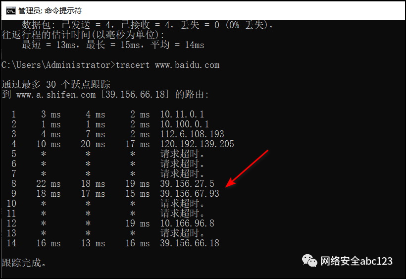 而伪造异常返回包的TTL值是56,假设劫持者发送数据包的初始TTL值是64,通过计算64-56=8,说明劫持者的位置与我本机相隔8个路由节点,那么出问题的节点应该是在如下图所示的第9个节点。