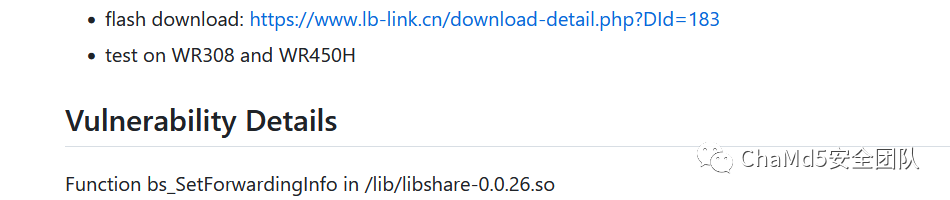 笔者这里就拿在github上看到某个的今年新出的cve(https://github.com/kagehutatsu/IOT_Vulnerability/tree/main/LB-Link/WR450H/CVE-2023-26697),来看一下这个工具效果。看漏洞提交报告可知,漏洞函数是**./lib/libshare-0.0.26.so里的定义的bs_SetForwardingInfo **。