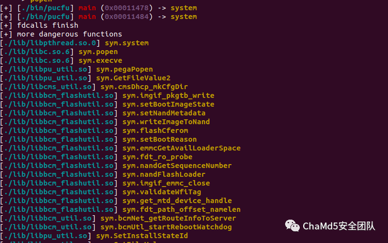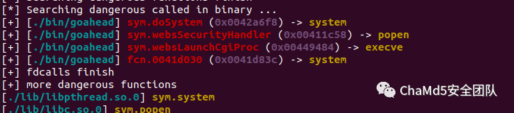 第二个模式会显示所有可能的危险函数。加上这个模式的原因是,因为笔者的能力有限,所以一些函数调用处可能处理的不是很好,故有一些危险函数虽然会被会被调用却没能在上面的路径当中显示出来。如下图所示,我们可以看到可能存在的危险函数以及定义他们的动态链接库。我们在模式以扫描出的路径中不能发现漏洞或者扫描不出路径时,可以去二进制文件中搜索这些函数名,如果函数存在那么也有存在漏洞的可能。