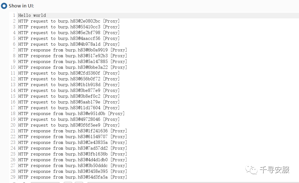 publicvoid processHttpMessage(int toolFlag, boolean messageIsRequest,IHttpRequestResponse messageInfo) {byte[] response = messageInfo.getResponse();byte[] request = messageInfo.getRequest();String InputText = bui.inputText();if (InputText != null) {/如果输入框无值,则不执行下列代码stdout = new PrintWriter(callbacks.getStdout(), true);stdout.println(InputText);if (messageIsRequest) {//处理request数据包}else{//处理reponse数据包}