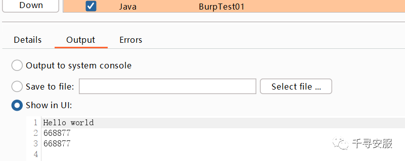 2.将编写的插件添加到burp extender中,查看Output和Errors: