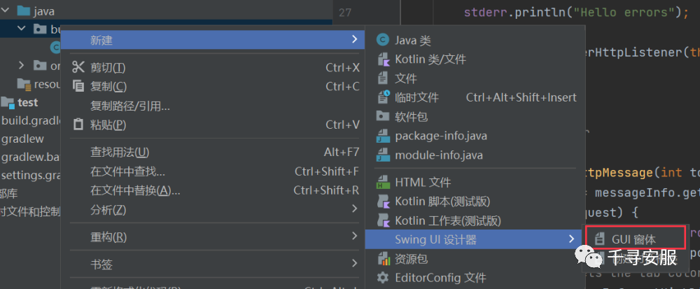 3.在Burp文件夹中,创建UI。右键,新建->Swing UI设计器->GUI窗体,取名任意。文档中取名为bUI。