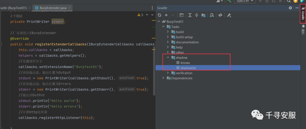 plugins{id 'java'id 'com.github.johnrengelman.shadow'version '5.2.0'}group'org.example'versionrepositories {mavenCentral()}dependencies {testImplementationgroup: 'junit', name: 'junit', version:'4.12'//compile('net.portswigger.burp.extender:burp-extender-api:1.7.13')implementation('net.portswigger.burp.extender:burp-extender-api:2.3')implementation('com.intellij:forms_rt:7.0.3')}
