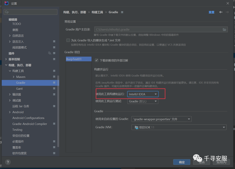2.在构建、执行、部署->Gradle中,将使用此工具构建和运行,更改为IntelliJ IDEA。