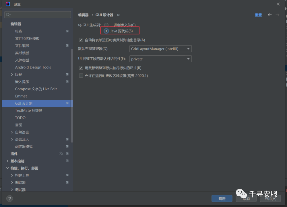 1.在设置中,设置->编辑器->GUI设计器,勾选JAVA源代码:
