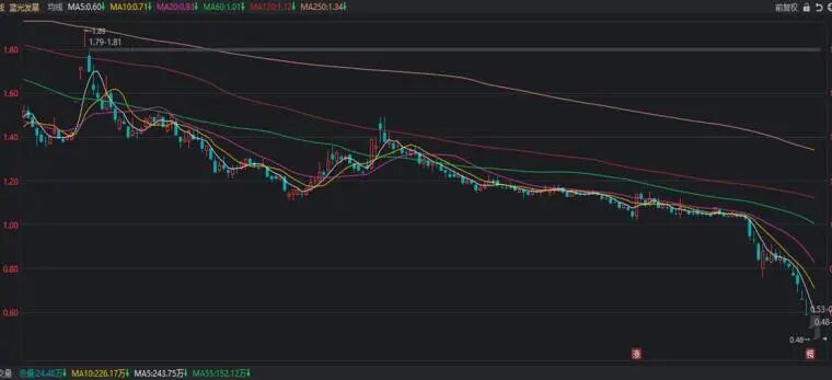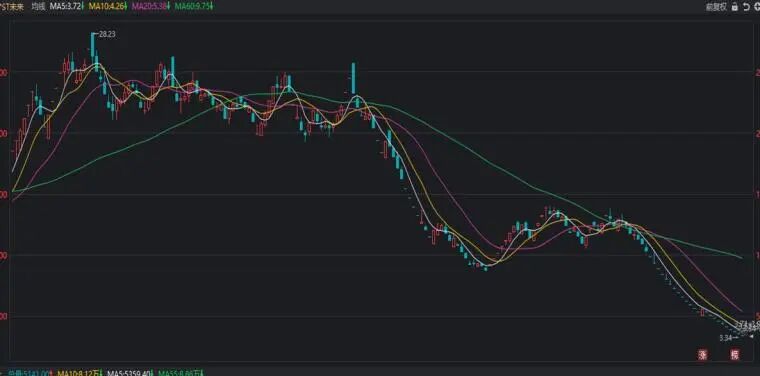 看上图,论术随便在跌幅榜找了二个股票,这种是均线系统空头排列,也就是指向性下跌的均线组合。60线在上,其他均线在下,用半年线,年线更清晰。
