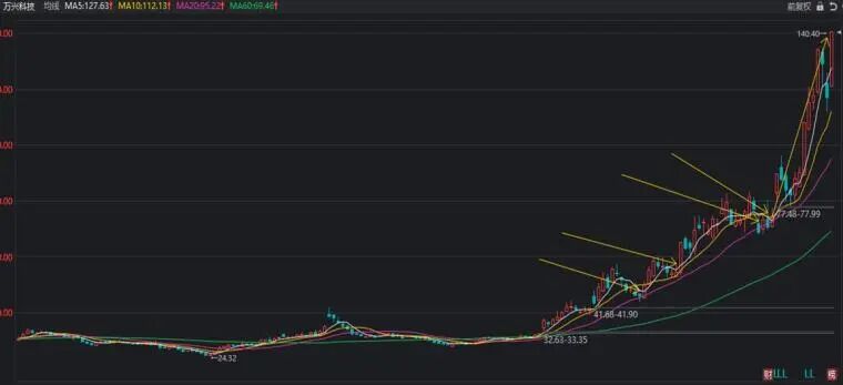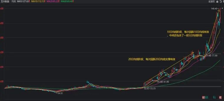 看上图,万兴科技,第一波慢速主升阶段是沿着20均线上涨,每次回踩20均线支撑有效,因此由20均线的支撑就构成了,均线系统下的相对安全买点,这个买点是比第一章K线引发的相对安全买点是要提前了。
