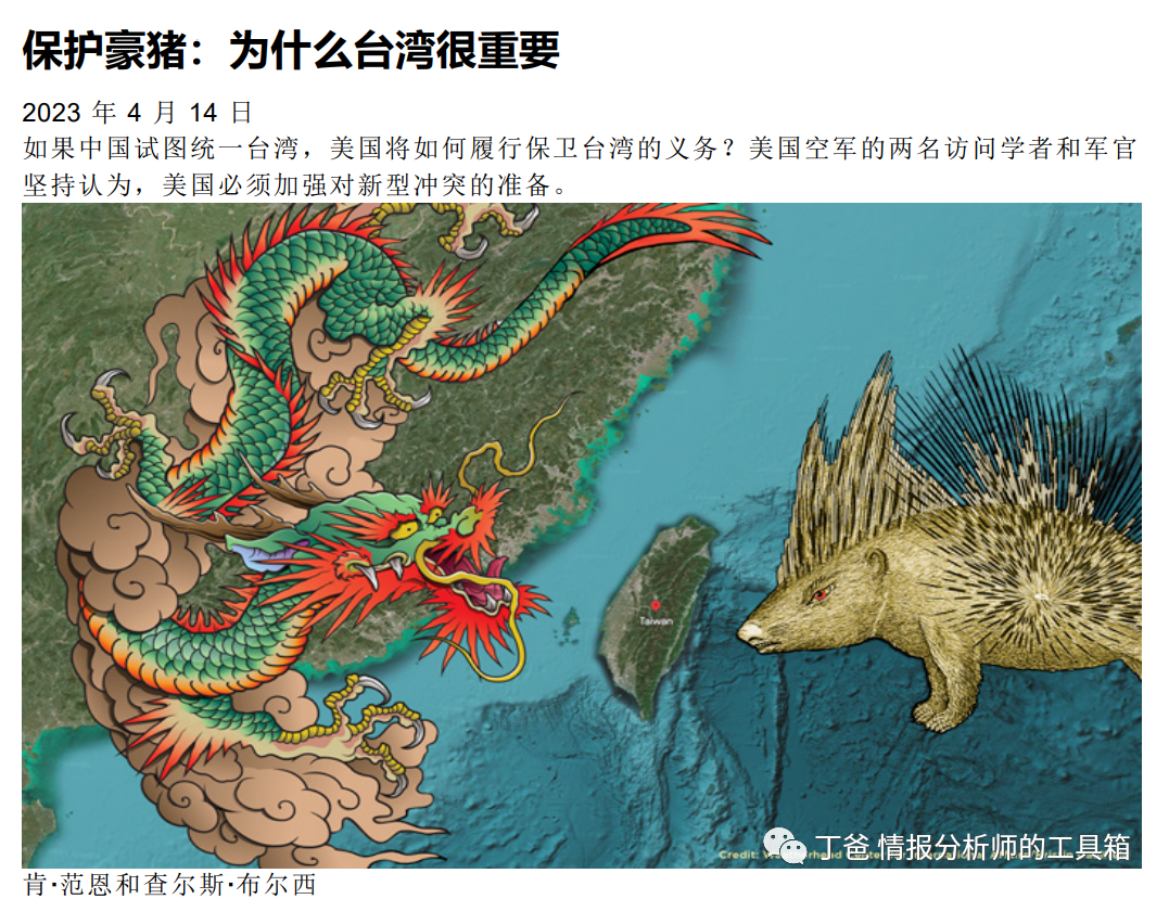 该文章从民主、芯片、贸易三个角度阐述了台湾对于美国的重要性。同时强调了美军的能力有待提高,并建议加大对台军售,重点如肩扛式防空和坦克导弹发射器和攻击无人机,将台湾打造成“豪猪”。