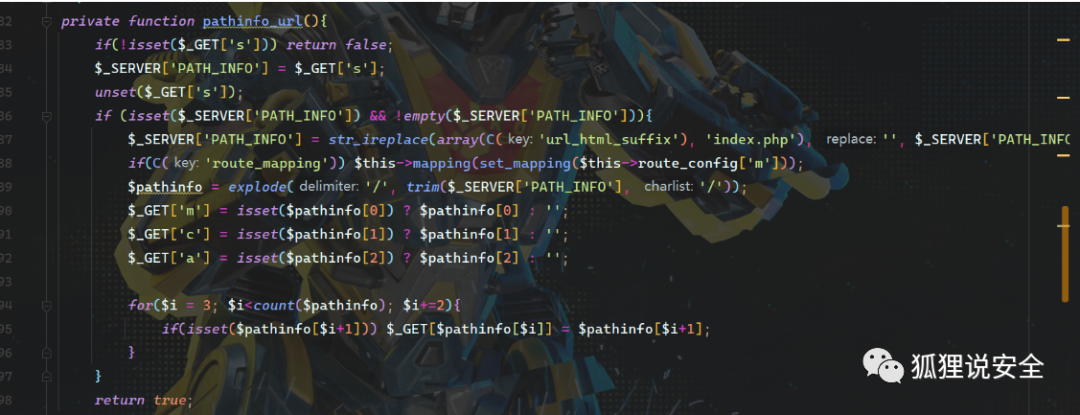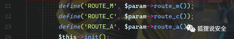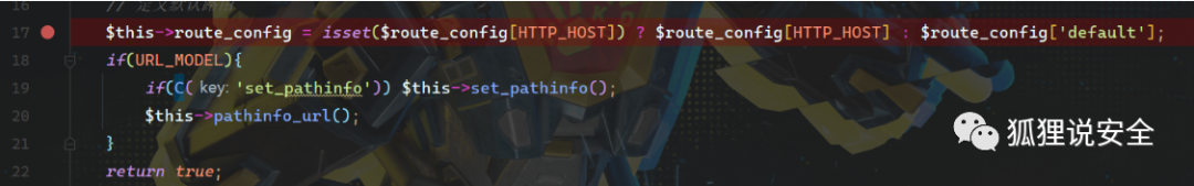 这里有个路由设置,default在/common/config/config.php出现过,这部分是定义路由。第19行C为false,看到20行有个pathinfo_url(),跟进