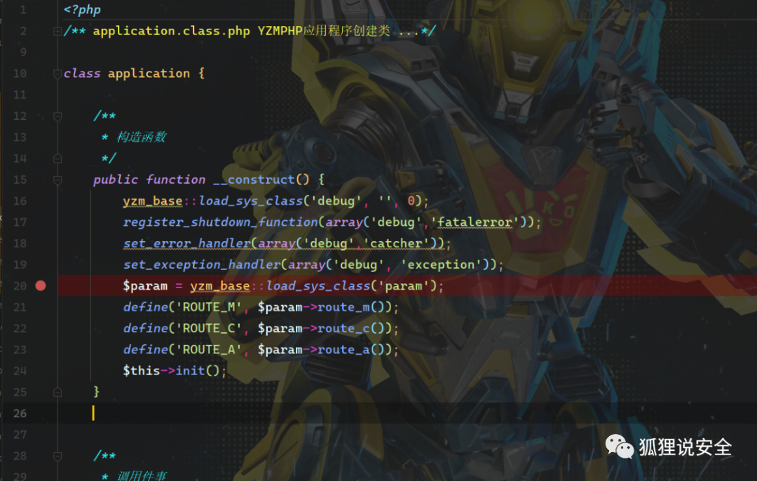 因为实例化了application类,会自动调用__construct构造方法,主要看第20行,前面是debug的,这里给load_sys_class传入了param参数,在上面已经跟进过load_sys_class静态方法了,实际上这里是包含的/yzmphp/core/class/param.class.php。OK,跟进下,在这里打个断点