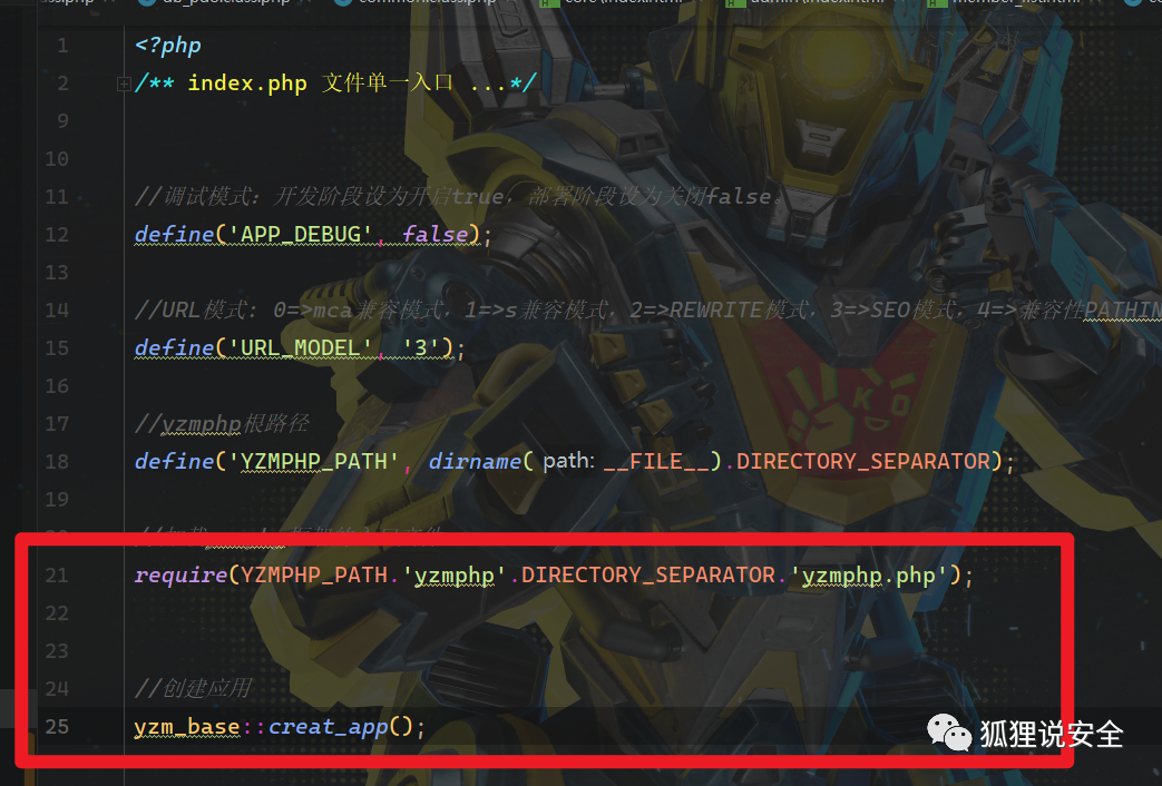 21行有个require,require==x:\cms\yzmcms-master\,实际上是包含了当前目录下的/yzmphp/yzmphp.php文件