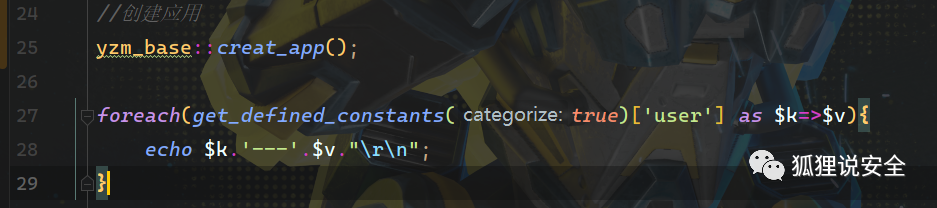 foreach(get_defined_constants(true)['user'] as $k=>$v){echo $k.'---'.$v."\r\n";}