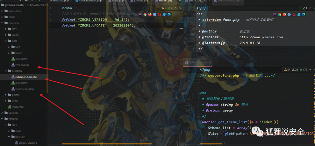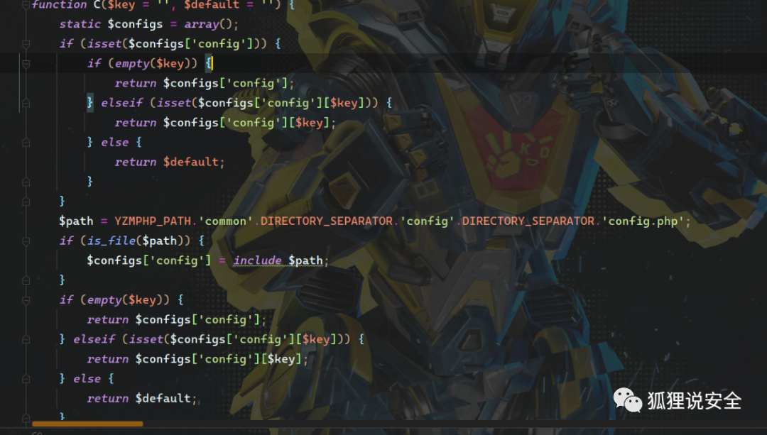 version.php文件只是定义了常量,extention.func.php文件什么也没做,system.func.php中定义了一些方法。继续跟进yzmphp.php,yzmphp.php在后面定义完类之后就没有任何操作