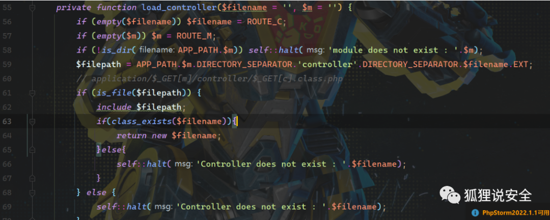 59行实际上是application/$_GET[m]/controller/$_GET[c].class.php,然后62行对其包含,然后64行是实例化包含进来的类,回到上一步