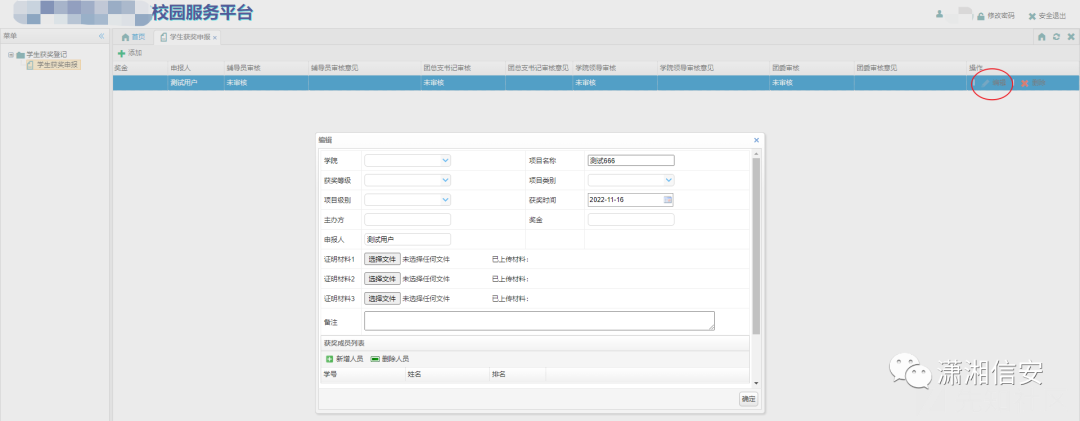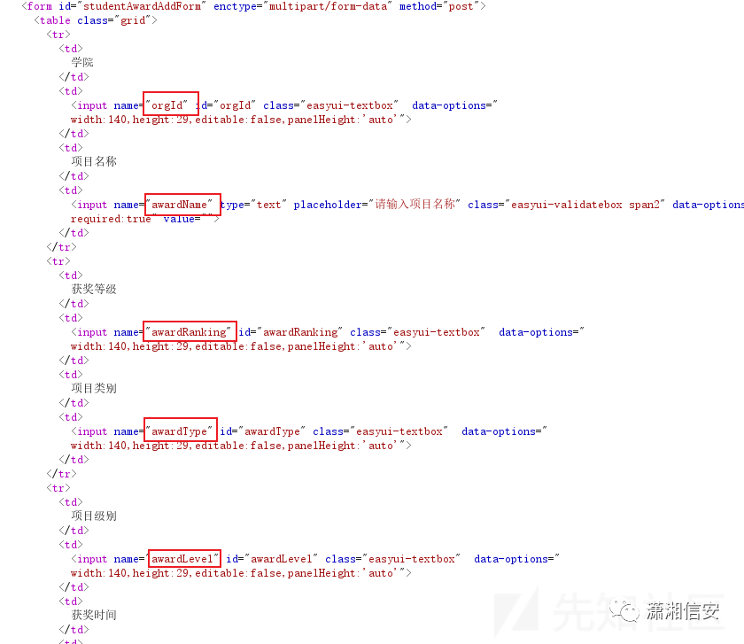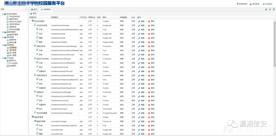 addPage就是刚才内联框架所使用的HTML文件,里面不仅包含了相关的接口,还包含了表单的字段名并且接口名称studentward、role、resource、counsellor都是跟功能相关的英文,非常好猜