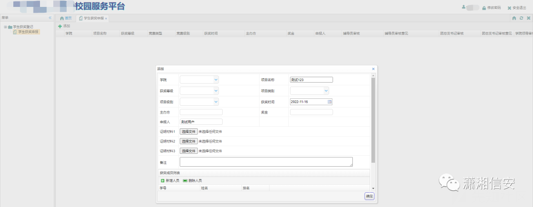 <script type="text/javascript">$(function() {$('#userAddOrganizationId').combotree({url : '/organization/tree',parentField : 'pid',lines : true,panelHeight : '200'});$('#userAddRoleIds').combotree({url: '/role/tree',multiple: true,required: true,panelHeight : 'auto'});$('#sex').combobox({url:'/dict/loadcombobox?code=sex',method: 'get',valueField:'val',textField:'description',panelHeight : 'auto',groupField:'group'});$('#userType').combobox({url:'/dict/loadcombobox?code=userType',method: 'get',valueField:'val',textField:'description',panelHeight : 'auto',groupField:'group'});$('#userStatus').combobox({url:'/dict/loadcombobox?code=userStatus',method: 'get',valueField:'val',textField:'description',panelHeight : 'auto',groupField:'group'});$('#userAddForm').form({url : '/user/add',onSubmit : function() {progressLoad();var isValid = $(this).form('validate');if (!isValid) {progressClose();}return isValid;},success : function(result) {progressClose();result = $.parseJSON(result);if (result.success) {parent.$.modalDialog.openner_dataGrid.datagrid('reload');parent.$.modalDialog.handler.dialog('close');} else {var form = $('#userAddForm');parent.$.messager.alert('提示', eval(result.msg), 'warning');}}});});</script><div class="easyui-layout" data-options="fit:true,border:false"><div data-options="region:'center',border:false" title="" style="overflow: hidden;padding: 3px;"><form id="userAddForm" method="post"><table class="grid"><tr><td>学工号</td><td><input name="loginName" type="text" placeholder="请输入登录名称" class="easyui-validatebox" data-options="required:true" value=""></td><td>姓名</td><td><input name="name" type="text" placeholder="请输入姓名" class="easyui-validatebox" data-options="required:true" value=""></td></tr><tr><td>密码</td><td><input name="password" type="password" placeholder="请输入密码" class="easyui-validatebox" data-options="required:true"></td><td>性别</td><td><input name="sex" class="easyui-textbox" id="sex" type="text" style="width: 140px; height: 29px;"></td></tr><tr><td>年龄</td><td><input type="text" name="age" class="easyui-numberbox"/></td><td>用户类型</td><td><input name="userType" class="easyui-textbox" id="userType" type="text" style="width: 140px; height: 29px;"></td></tr><tr><td>部门</td><td><select id="userAddOrganizationId" name="organizationId" style="width: 140px; height: 29px;" class="easyui-validatebox" data-options="required:true"></select></td><td>角色</td><td><select id="userAddRoleIds" name="roleIds" style="width: 140px; height: 29px;"></select></td></tr><tr><td>电话</td><td><input type="text" name="phone" class="easyui-numberbox"/></td><td>用户状态</td><td><input name="status" class="easyui-textbox" id="userStatus" type="text" style="width: 140px; height: 29px;"></td></tr></table></form></div></div>