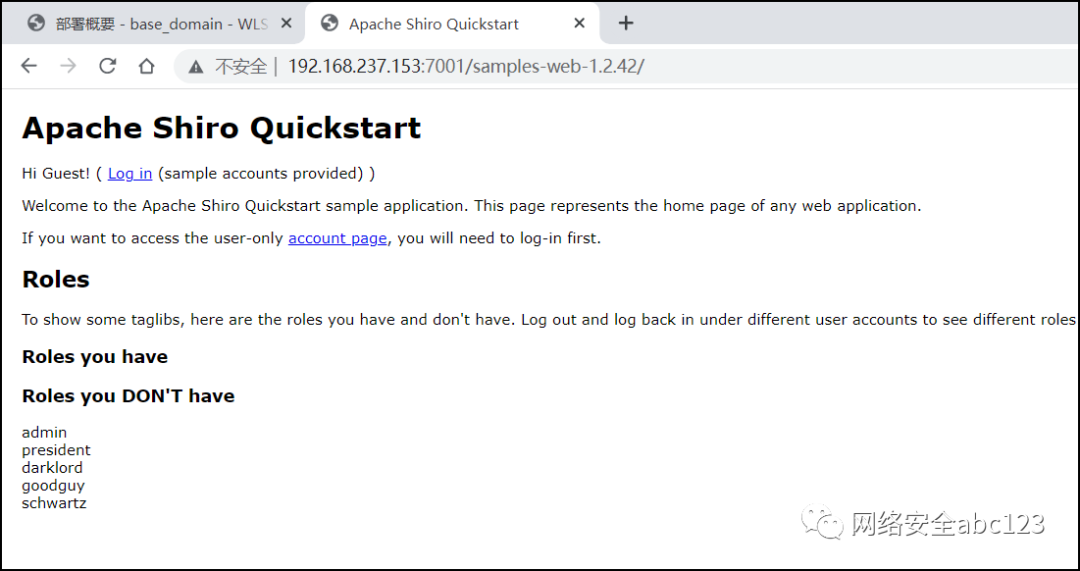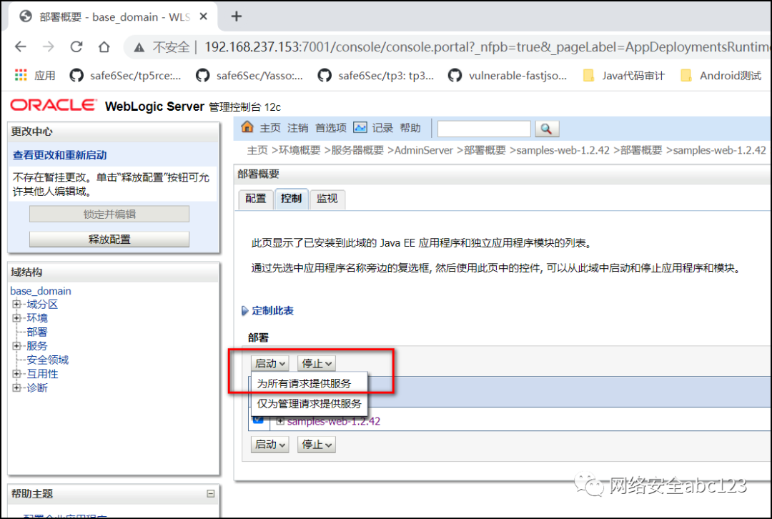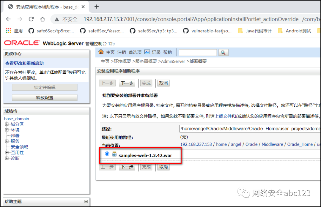 首先需要搭建一个在weblogic下的shiro网站应用,于是从github上搜索了一个samples-web-1.2.42.war包,上传到weblogic中间件中进行部署。