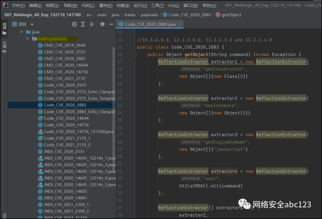 Weblogic的Coherence组件反序列化漏洞的POC有好几个,主要包括CVE-2020-2555、CVE-2020-2883、CVE-2020-14756、CVE-2021-2135等等,每个反序列化exp其实就对应着Weblogic中间件下的一条反序列化利用链,选择也是很有技巧的,因为每个EXP都各有优缺点。比如说,CVE-2020-2555的exp用到了BadAttributeValueExpException这个类,这个类只在JDK1.8下才能用,适用范围就窄了;CVE-2021-2394与CVE-2022-21350只能发起jndi请求,因此只有在出网的情况下才能利用。后续有人把CVE-2020-2883的POC中的BadAttributeValueExpException这个类换掉,使POC更加通用。最终经过一系列对比筛选,CVE-2020-2883、CVE-2020-14756、CVE-2021-2135这三个POC看起来比较通用,而且这三个POC可以接Javascript引擎,执行任意Java代码,为后续通过shiro打weblogic内存马打下基础。于是就拿来测试了一下。