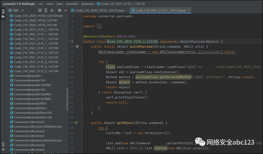接下来需要做的事情是将不同Weblogic版本的Coherence利用链整合进ysoserial工具包中,这样可以直接调用ysoserial工具来生成shiro反序列化的poc。这里就遇到了一个非常大的麻烦,Weblogic有不同版本如12.2.130、12.2.140、14.1.100等等,每个细微版本的Coherence库的SUID都不一样,在反序列化漏洞利用过程中,SUID对不上,是没法反序列化成功的。网上有文章对Weblogic下的Coherence组件的不同SUID做了总结,但是我本地反复测试的结果,好像与网上的文章给的结果不太一样。为了解决这一问题,我也不纠结了,综合考虑时间与成本,选用了最简单的URLClassLoader类加载不同版本的Coherence的jar包的方法,将不同weblogic版本的coherence POC融合进ysoserial工具包中。