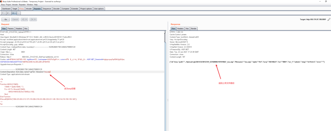 这里我上传的时候,发现它有验证,但是我用bp抓包发现点击上传时,bp并没有抓到包,于是判断是前端验证,改上传文件后缀,然后抓包在改回来进行绕过