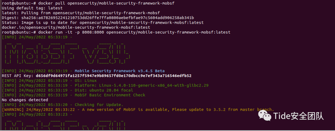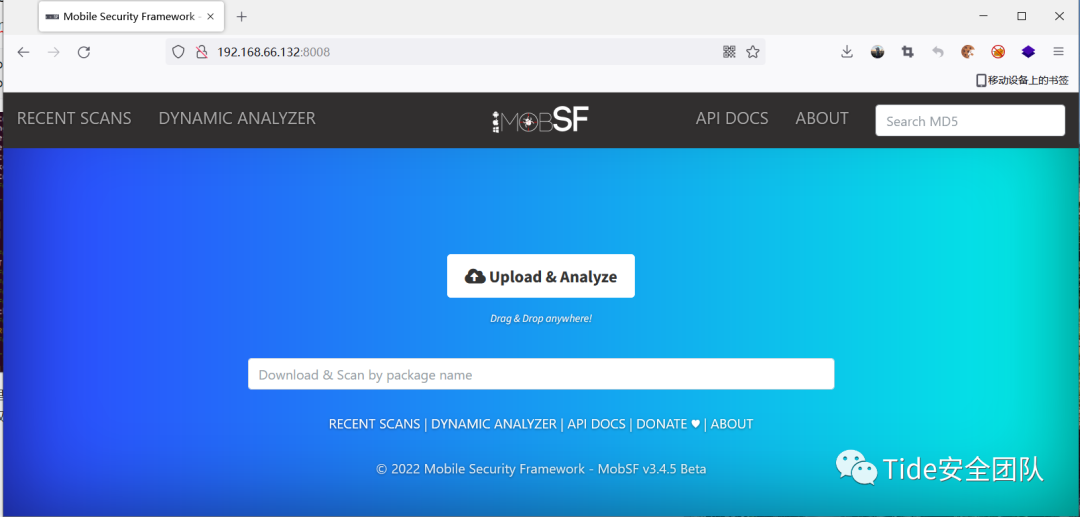 管道无缝集成。动态分析器可帮助您执行运行时安全评估和交互式仪器测试。MonSF是基于docker运行的,我们只需要找来一台安装docker的主机运行如下两条命令即可docker pull opensecurity/mobile-security-framework-mobsfdocker run -it -p 8008:8000 opensecurity/mobile-security-framework-mobsf:late