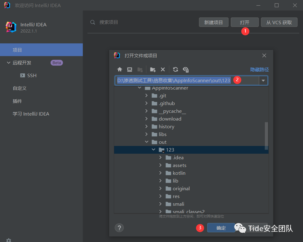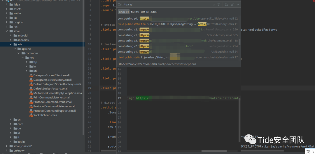 这时,AppinfoScanner就会将该APK中所涉及到的链接全部都提取出来,在扫描后会在AppinfoScanner中输出一个以当前时间命名的xls文件,其中就包含了对该APP中所提取的一些资产信息,但是该xls中的资产提取的并不完整,可能是我APK的原因吧在out文件夹中还会有一个以该APK名所命名的文件夹,里面存放这该APK所逆向出来的源代码,这里我们可以将该源代码导入到IDEA中打开IEDA,然后选择打开,选择所输出的文件夹,单击确定使用快捷键ctrl+shift+F全局搜索,去搜索该代码中的一些关键信息,如http://、https://等也可以获得一些关键信息MonSF