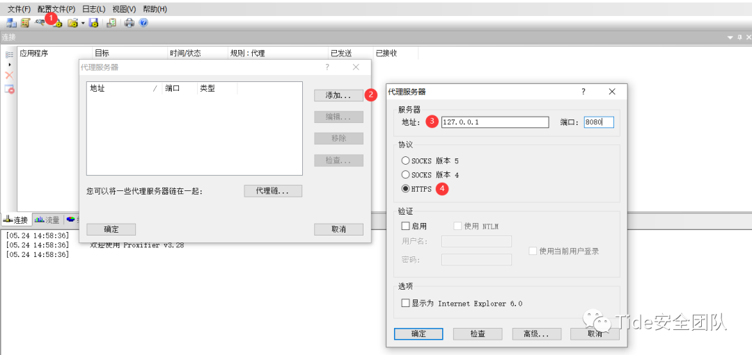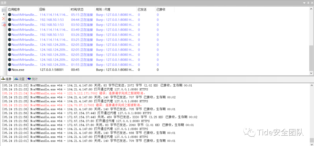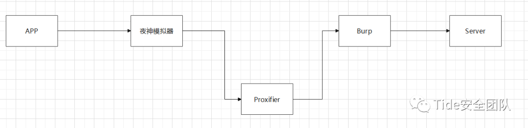 首先当我们的APK的检测机制为反代理时,我们该如何去进行一个绕过,这里他的判断机制是当检测到客户端启动代理时,不发送数据,那我们可以不使用模拟器的代理,而使用本机的代理工具去包含安卓模拟器去启动,再将代理工具的流量转发到我们的burp上,哪这样我们的流量走向就成了下图,模拟器中并没有设置代理,但是他的整个流量都会走proxifier,proxifier会将流量都转发到burp上面,从而达到绕过反代理的效果。首先打开我们在内网渗透测试中经常使用的代理工具Proxifier,到配置文件中的代理服务器选项–>添加代理服务器–>服务器ip地址与端口为burp所监听的端口–>协议选择HTTPS,点击确定点击确定之后,我们将夜神模拟器重启,可以看到数据包已经在传递了这时我们再打开反代理的APK时,就可以看到我们的burp已经成功接收到了数据那么如果APK是基于证书校验或者走了其他的比如SSL等协议,那这时候我们该如何去抓取该APK的数据包呢?这里我们就可以尝试使用frida+r0capture+wireshark组合,使用frida和r0capture联动去抓取该APK的所有数据包,然后使用wireshark去进行分析该APK的流量详情。https://github.com/r0ysue/r0capturehttps://github.com/frida/frida/releaseshttps://www.wireshark.org/#download