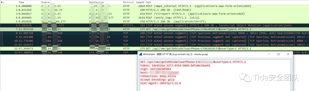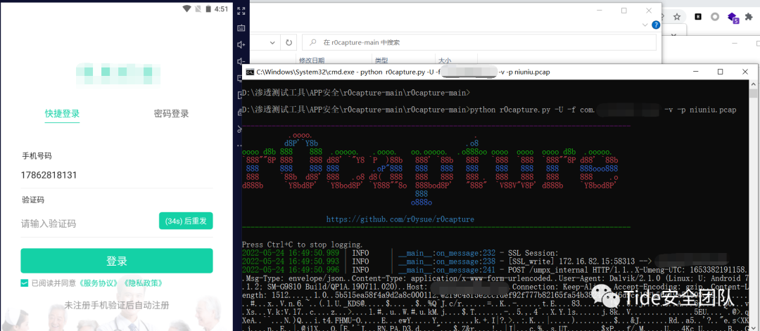 这时,r0capture就会自动启动该APK文件,并将我们在进行操作时的流量进行保存为pacp,当我们停止运行该APK后,就会在r0capture中看到命名的pacp文件这里就成功抓取到了我在进行验证时的数据包,成功绕过证书检测等机制,但是该方法有些弊端,就是所导出的数据包我们并不能将其进行修改,后续最佳的办法为frida+r0capture联动fillder和XPosed框架去绕过限制,但这里由于篇幅原因,下一篇再来说一说以下方法吧!Tide安全团队正式成立于2019年1月,是新潮信息旗下以互联网攻防技术研究为目标的安全团队,团队致力于分享高质量原创文章、开源安全工具、交流安全技术,研究方向覆盖网络攻防、系统安全、Web安全、移动终端、安全开发、物联网/工控安全/AI安全等多个领域。