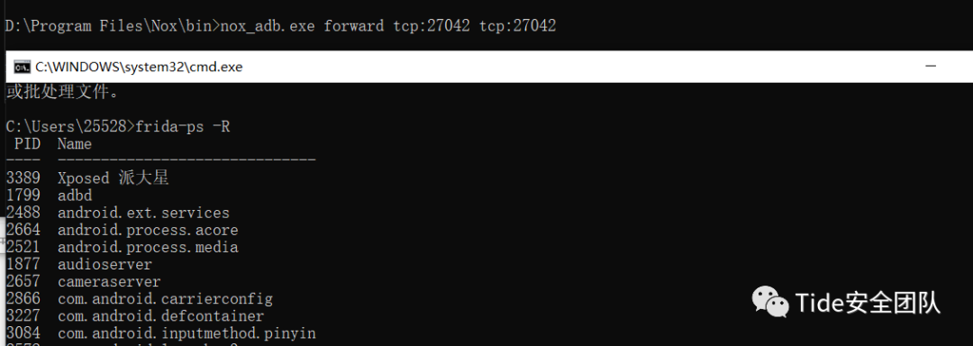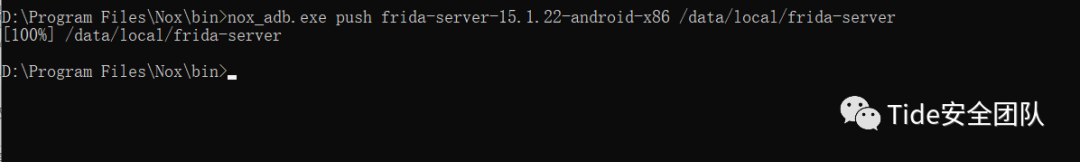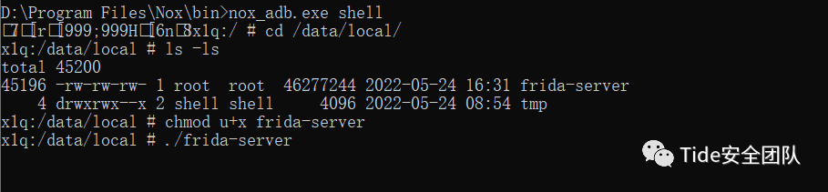 OK,上传成功,接下来进入到模拟器的bash视图下,执行frida-server即可nox_adb.exe shellcd /data/local/frida-serverls -lhchmod u+x frida-server