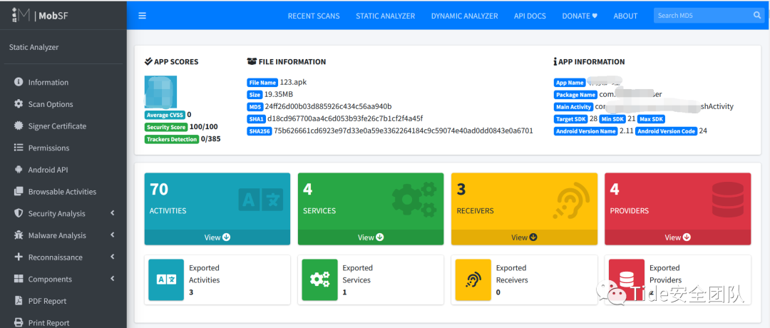 渗透测试、恶意软件分析和安全评估框架,能够执行静态和动态分析。MobSF 支持移动应用程序二进制文件(APK、XAPK、IPA 和