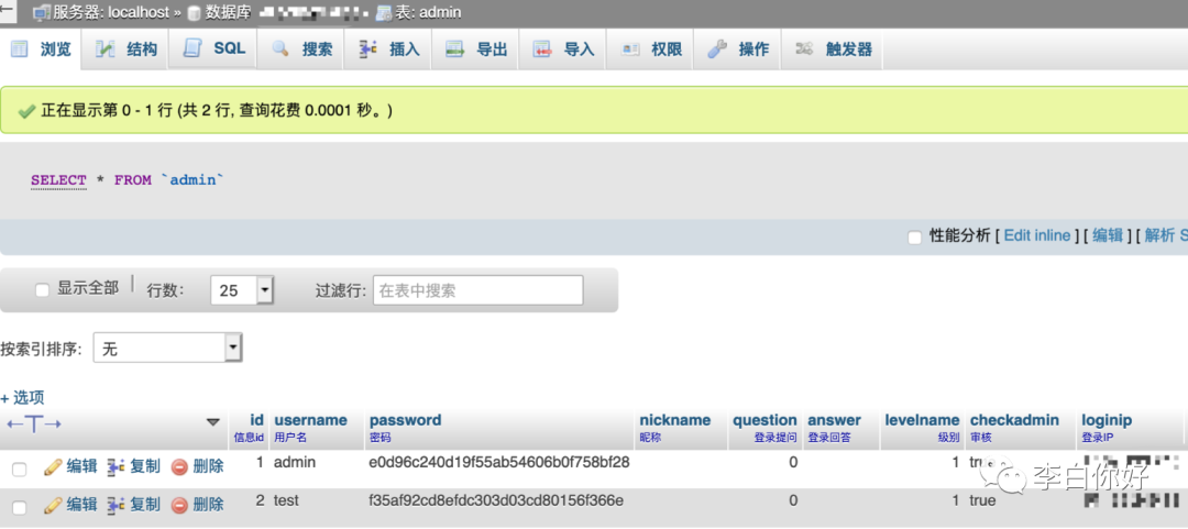 找了一下发现另一个admin表,怀疑是phpmywind的管理员表,md5解不出,自己加了一个用户进去test/testtesttestaaa,登陆成功