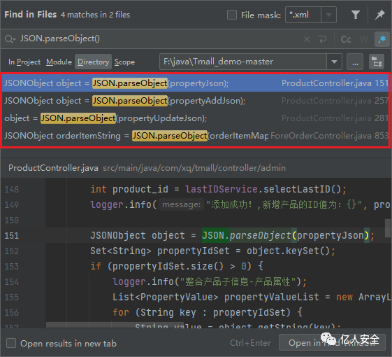 全局搜索两个关键字JSON.parseObject()和JSON.parse(),发现本项目存在JSON.parseObject()。