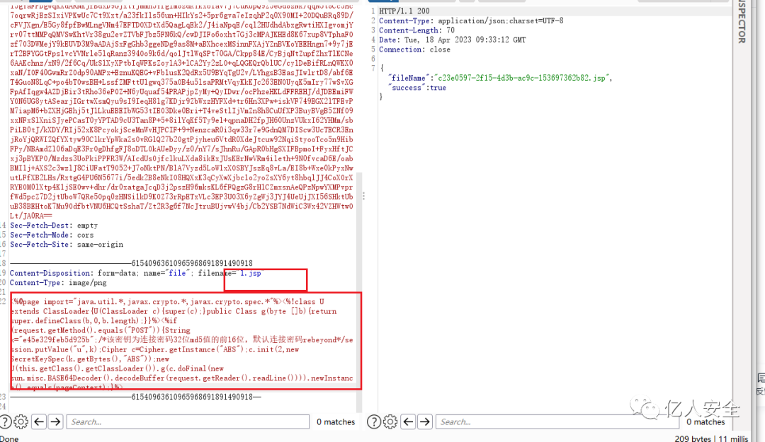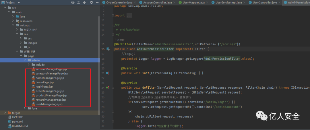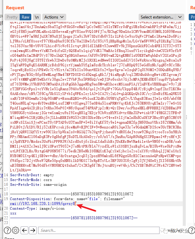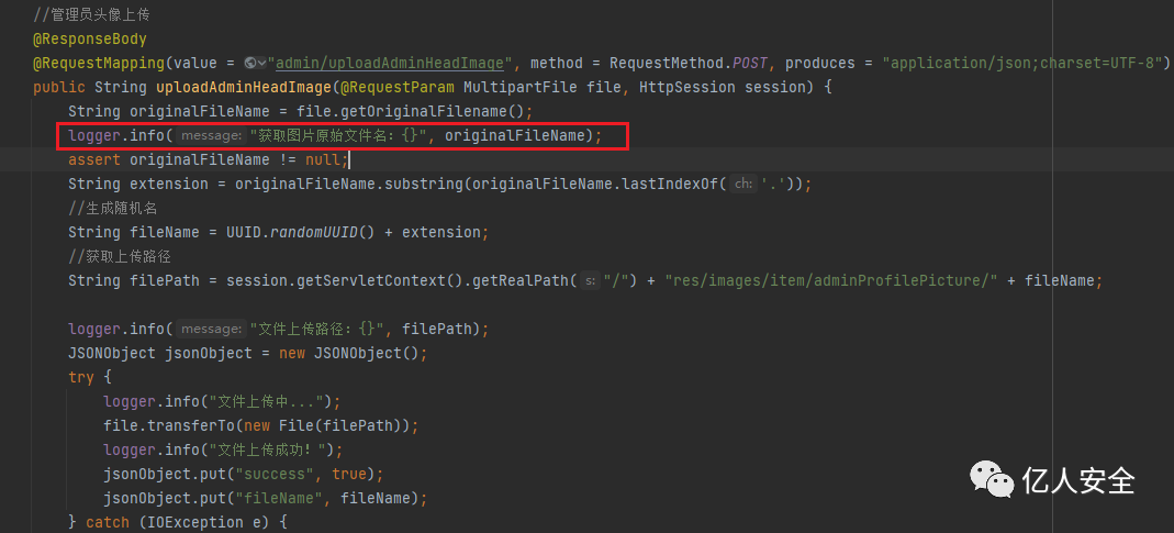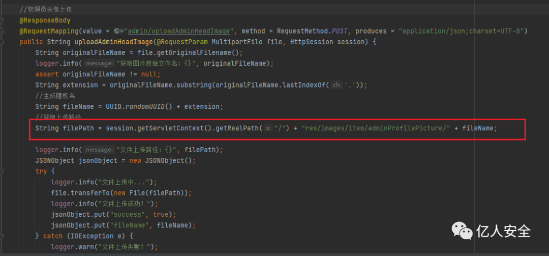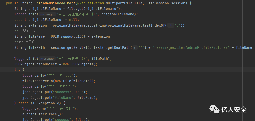 发现uploadAdminHeadImage方法接受绑定的file参数和session参数,我们查看file参数。然后接着进入第64行,获取到文件名称后赋值给originalFileName。然后获取文件后缀名,先看括号内originalFileName.lastIndexOf('.'),获取originalFileName字符串最后一次出现.的地方。然后通过substring截取子串的方式得到文件后缀名,赋值给变量extension。发现传入.jsp.jsp.jsp这种形式后缀名,最后得到的结果也只有.jsp。第69行,随机命名文件,采用UUID+extension方式,并赋值给fileName参数。第71行,获取上传路径,赋值给filePath。第76到80行,上传文件关键代码,创建文件流将文件上传到filePath路径中,上传成功后,会返回该文件的文件名。