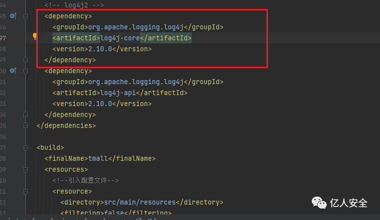 pom.xml文件引入Log4j组件情况如下图所示,引入了log4j-core,以及版本为2.10.0。