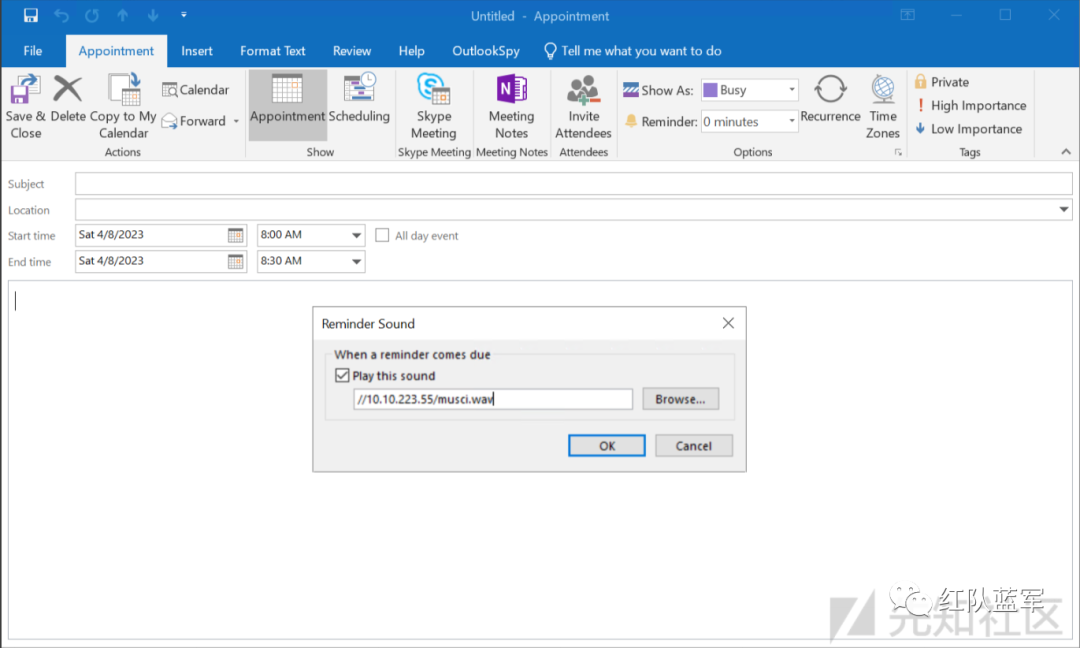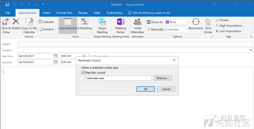 Outlook应用无法直接将提醒的声音文件设置为UNC路径,但是我们可以用OutlookSpy插件来实现此操作。这个插件会允许我们直接访问Outlook所有的内部参数,包括提醒的声音文件。