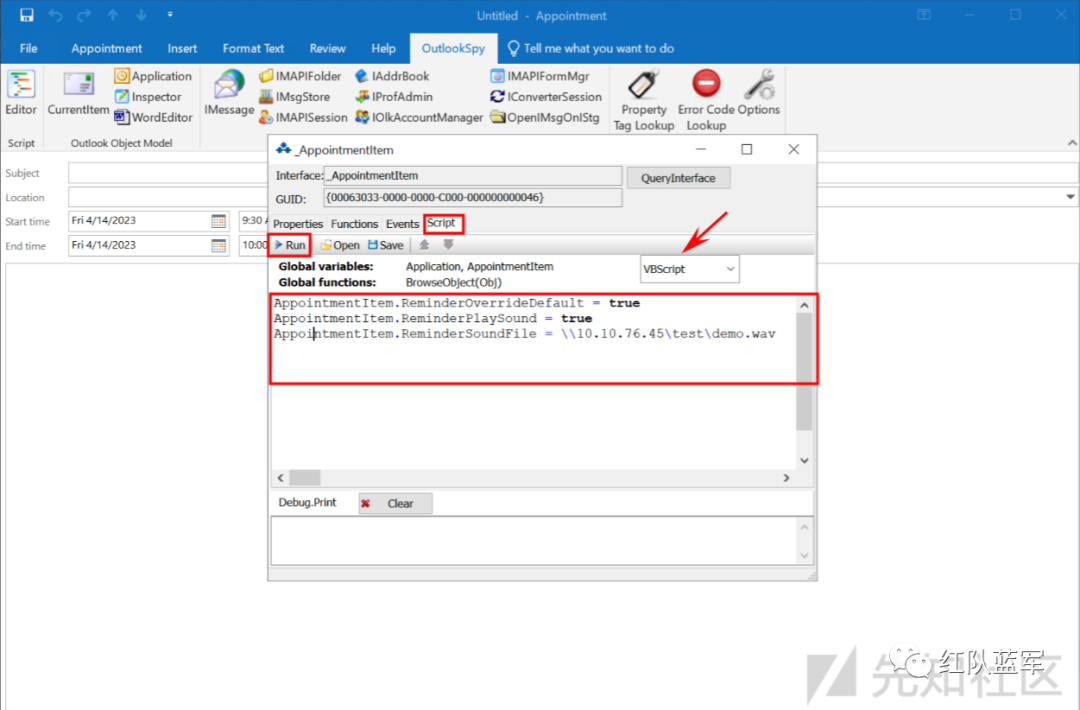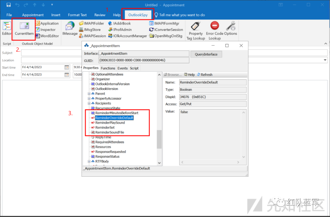 确保在新建的Appointment中访问OutlookSpy,注意:否则可能会更改不同的Outlook组件。