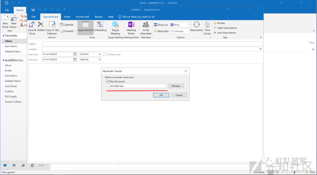 确保更改生效,可以返回查看默认的ReminderSoundFile,如下图,默认音频文件已经改变。最后,保存Appointment,提醒设置为0分钟,以便立即触发它