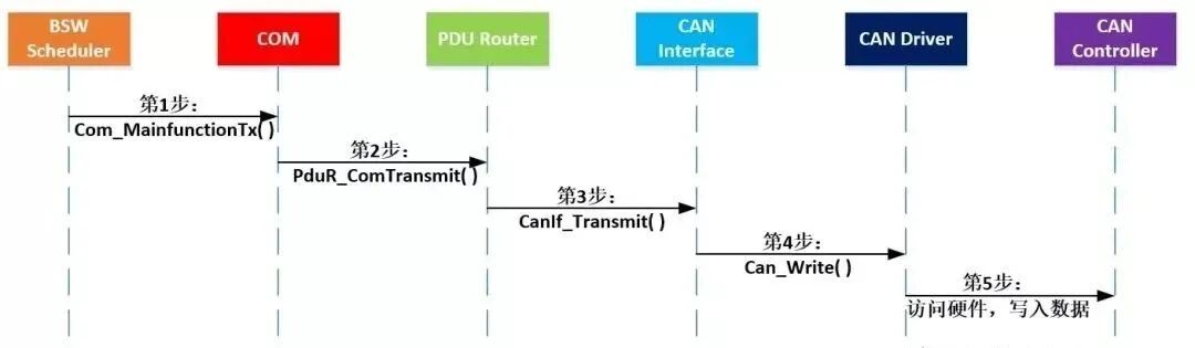 报文发送流程如下图所示。通过Com_ManfunctionTx将数据一层一层传递到CAN模块,并且通过Polling或者中断的形式将数据发送出去。
