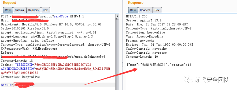 那么,可利用"\n"和空格进行绕过,持续递增空格就可造成无线短信轰炸,我们在手机号后面加一位进行fuzz,可能会有不一样的结果;
