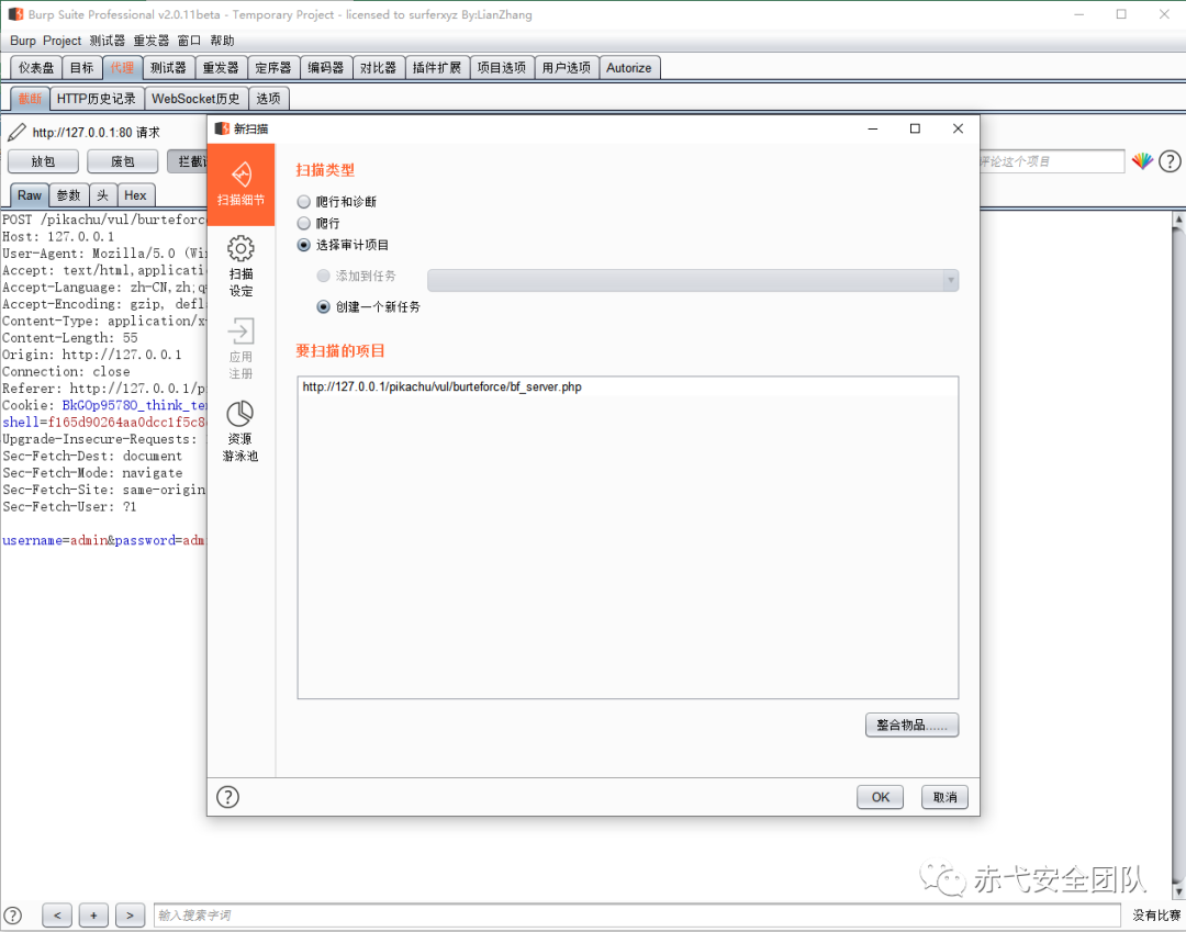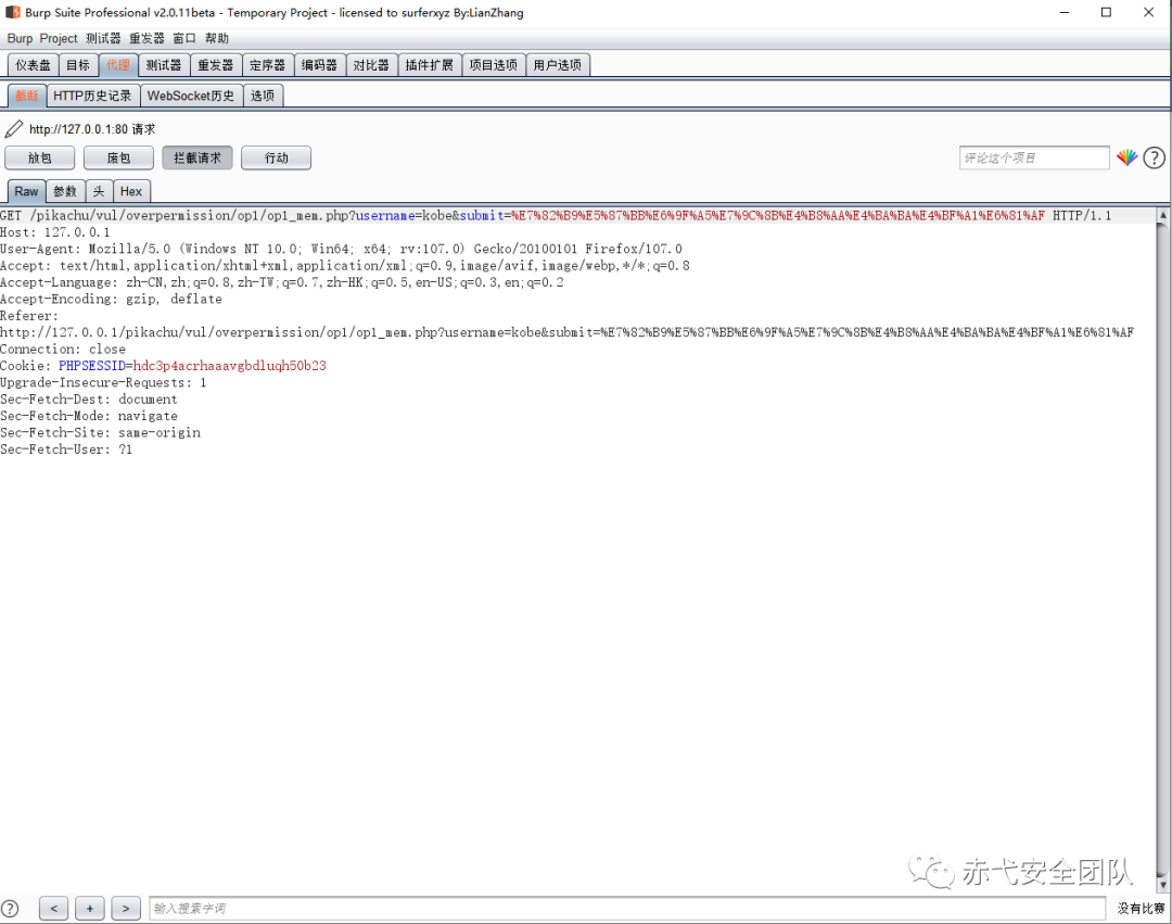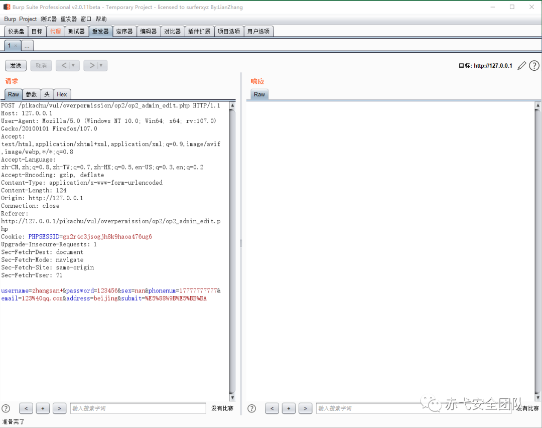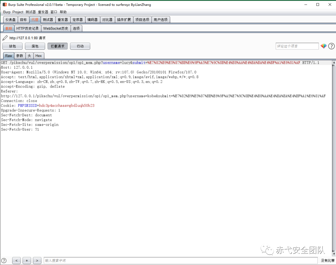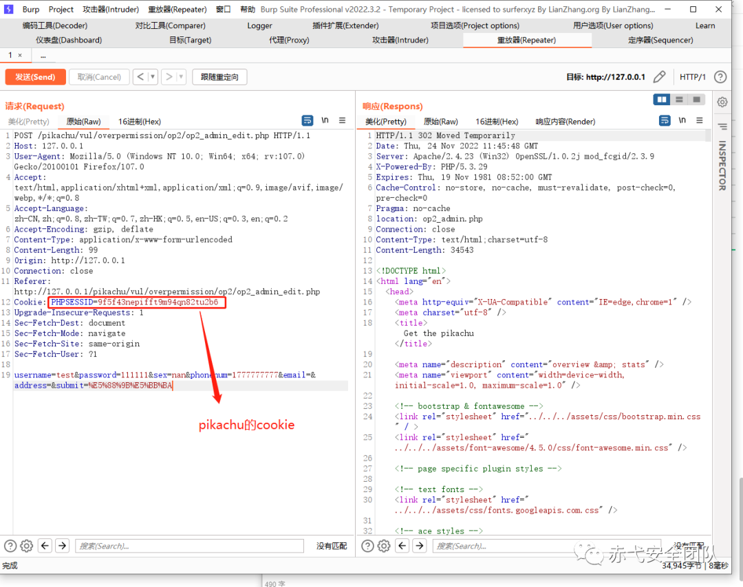 3)我们紧接着用pikachu/000000,进行登陆,抓包,将pikachu的cookie替换admin用户的cookie;