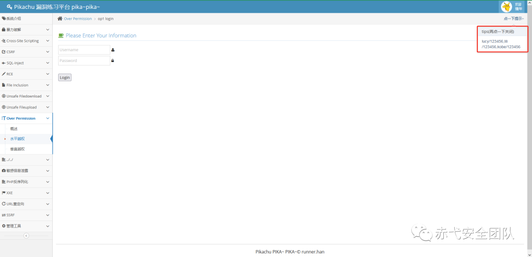 1)我们登陆到pikachu靶场,首先看一下提示: